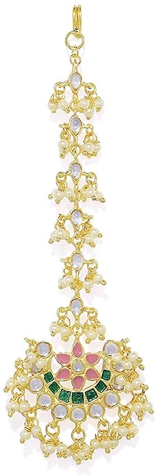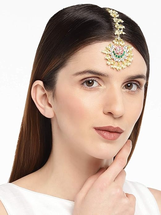 Enhance your traditional look with the Accessher Gold Plated Chandbali Style Maang Tikka. Featuring a stunning blend of vibrant Meenakari work and intricate Kundan embellishments, this Maang Tikka is designed to add a regal touch to your attire. The delicate addition of tiny pearls adds a classic elegance, making it a perfect accessory for weddings, festivals, or any special occasion. Crafted with care and precision, the Maang Tikka is gold-plated to give it a luxurious and timeless finish. Its lightweight design ensures comfortable wear, while the adjustable fit guarantees a secure and perfect placement on your hair. Whether you’re pairing it with traditional attire or giving a fusion twist to your look, this Maang Tikka will complete your ensemble beautifully. The vibrant colours and intricate detailing of the Meenakari and Kundan make this Maang Tikka an eye-catching accessory that will draw admiration from everyone around you. It s also a thoughtful gift option, presented in a beautiful box, making it an ideal present for loved ones on celebratory occasions. Treat yourself or a loved one to this elegant piece, and let its charm elevate your style on special occasions.