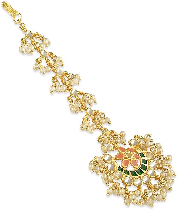 Accessher Gold Plated Traditional Multicolour Meenakari and Kundan Embellished Chandbali Style Maang Tika Embedded with Tiny Pearls for women and Girls