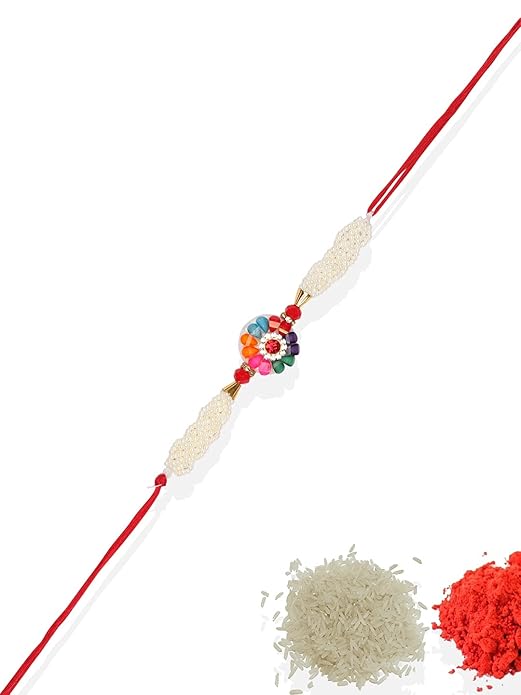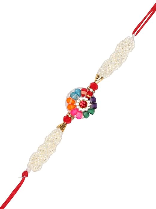 ACCESSHER Traditional Multicolor Pearl Rakhi for Brother Pack of 1 with Roli Kumkum Packets & Happy Rakshabandhan Card