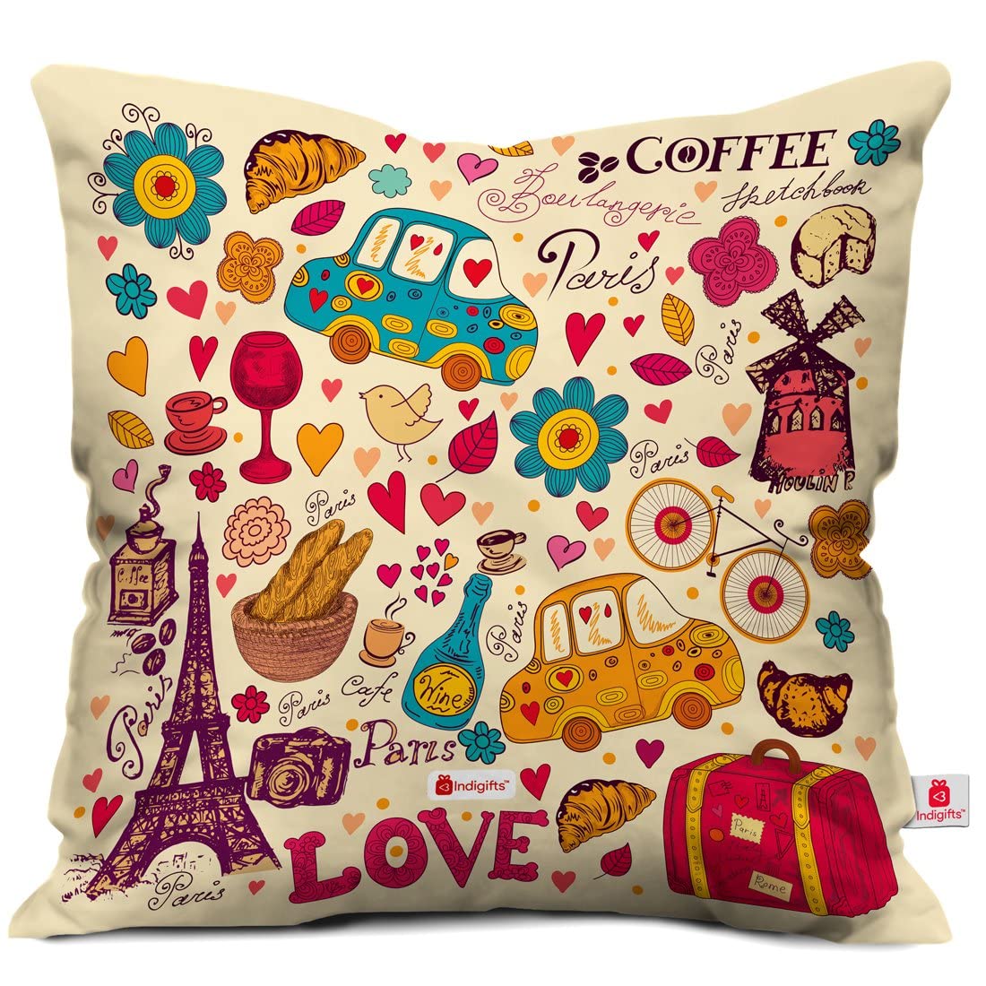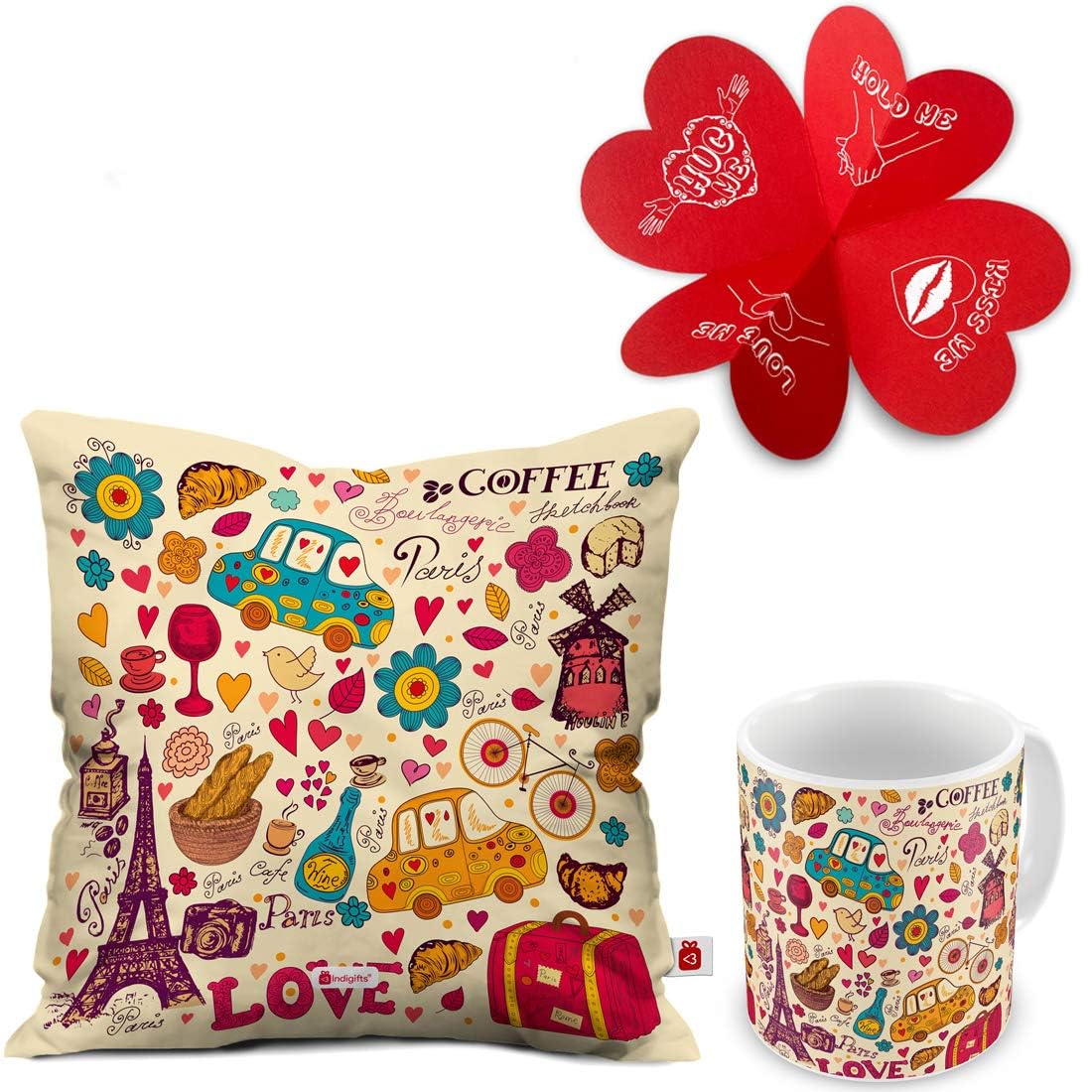 Indigifts Love Paris Coffee 12X12 Inches Printed Micro Satin and Fiber Filled Cushion and Ceramic Mug – Valentine Gifts for Girlfriend, Love Gifts For Boyfriend, Gift For Boyfriend Birthday