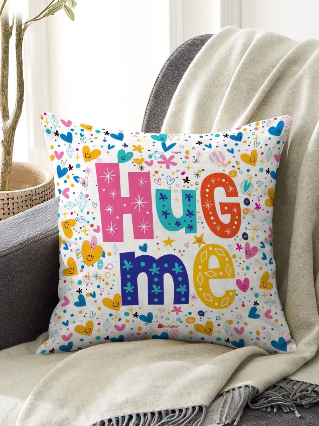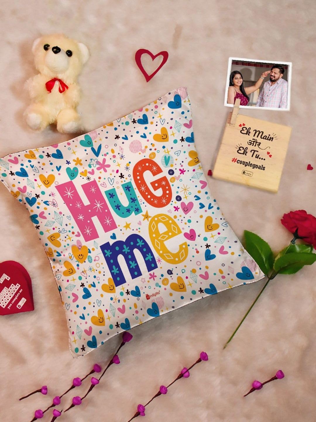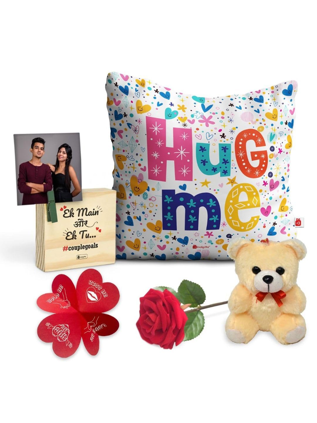 Indigifts Valentine Couple Gifts Box Satin Cushion Cover with Filler, Artificial Rose, Wooden Photo Stand, Card, Teddy Combo Pack (12×12)