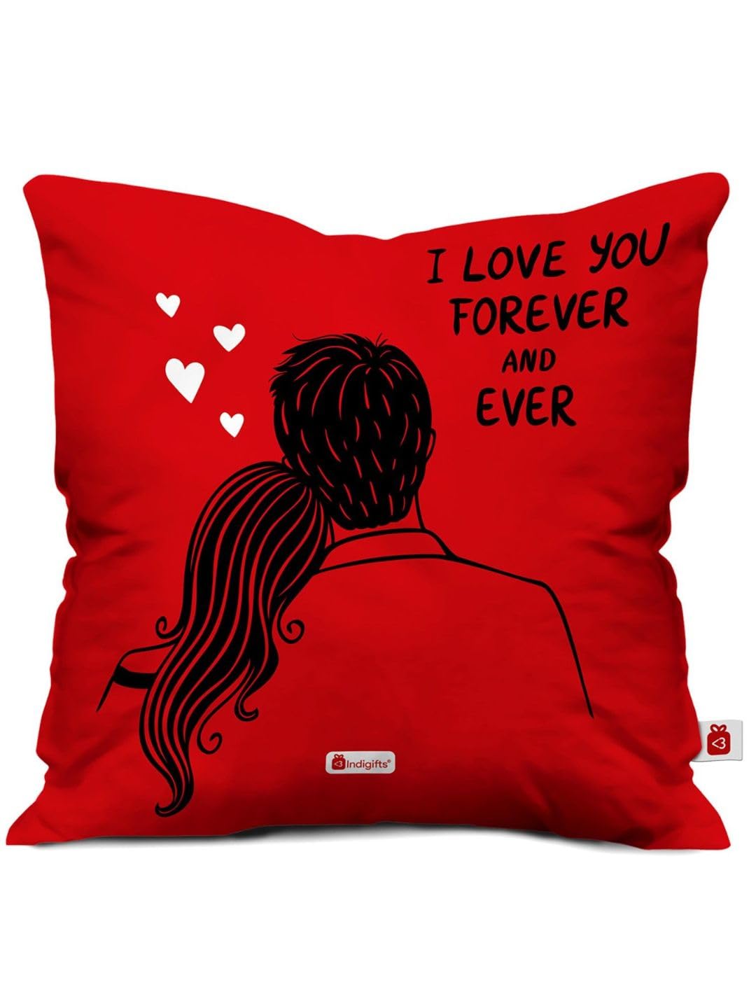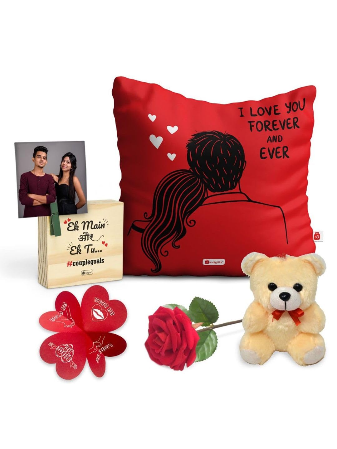 Indigifts Valentine Romantic gift Cotton Cushion Cover with Filler| Wooden Photo Stand| Greeting Card| Teddy| Artificial Red Rose| 12×12 inch| 1 Cushion Cover| 1 Filler|Teddy day Gift Anniversary Gift