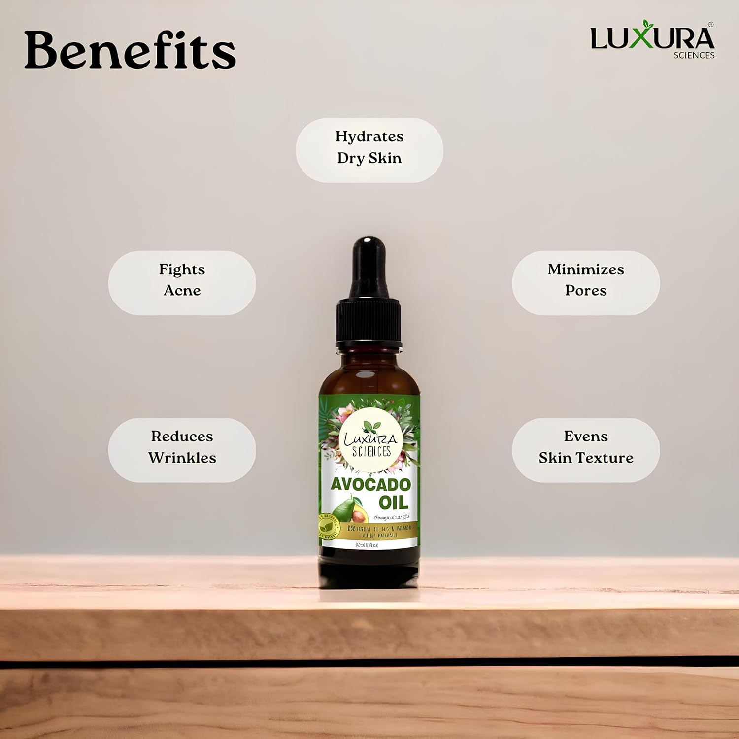 Luxura Sciences Avocado Oil – Deep Tissue Moisturizer for Hair Face & Skin – Rich in Retinol & Vitamin E to Reduce Wrinkles – Supports Skin Rejuvenation & Hair Growth (30 ML)
