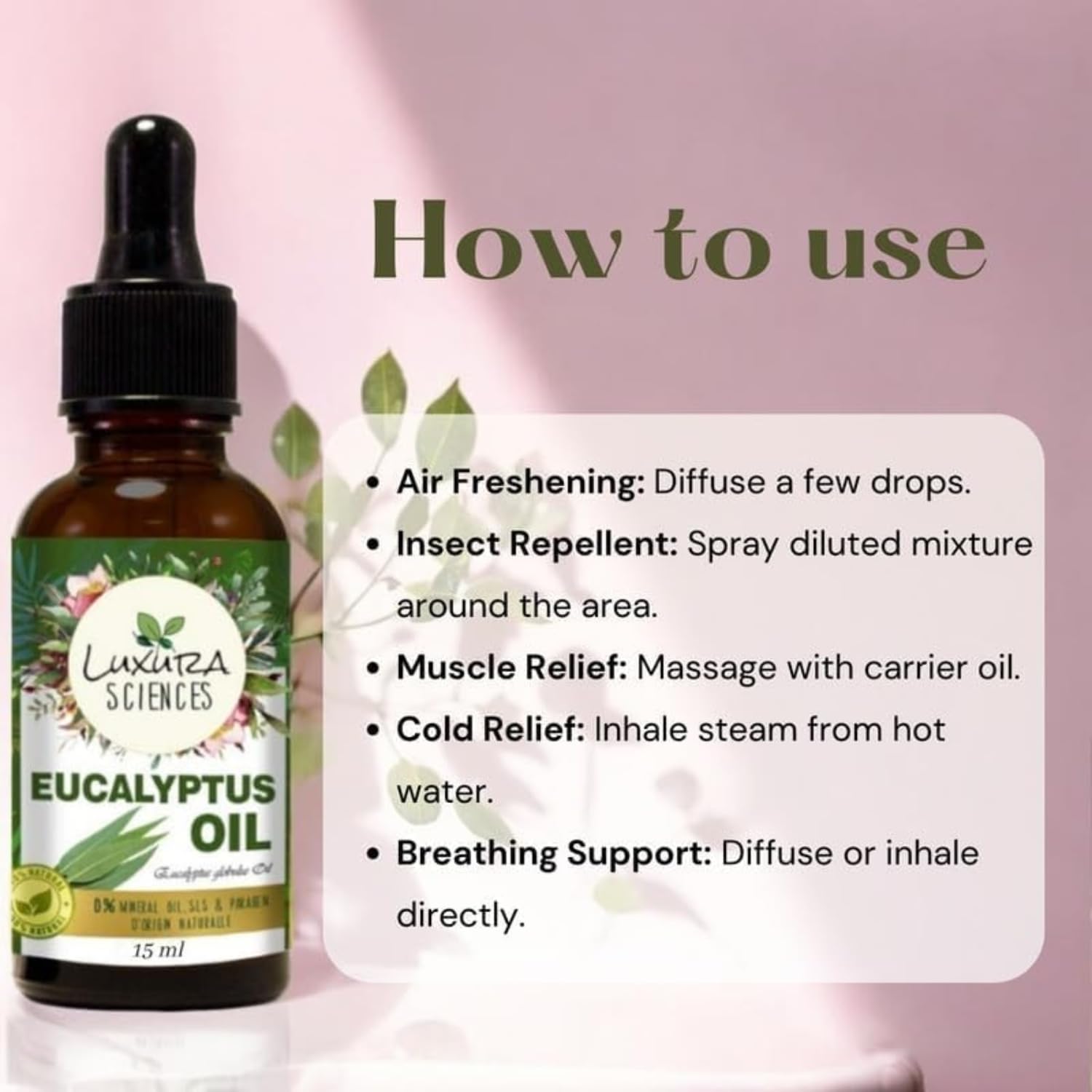 Luxura Sciences Eucalyptus Essential Oil (30ml) is a pure, steam-distilled essential oil crafted for those seeking natural wellness, aromatherapy, and relaxation. Sourced from premium eucalyptus leaves, this refreshing oil carries an invigorating, woody aroma that awakens the senses, helping to create a soothing yet energizing atmosphere in your home. Distilled through a chemical-free, double distillation process, this therapeutic-grade essential oil is free from toxins, additives, and fillers, ensuring the highest level of purity and potency. Its strong, fresh scent makes it a perfect addition to your aromatherapy routine, whether used in a diffuser, humidifier, or diluted for topical application. Eucalyptus Oil is known for its refreshing and cleansing properties, making it a versatile choice for skincare and hair care when mixed with a carrier oil. It can be gently massaged onto the scalp to help provide a revitalizing experience, or blended into DIY skincare formulations to enhance your routine naturally. Beyond self-care, Luxura Sciences Eucalyptus Essential Oil is also a wonderful home freshener. A few drops in your humidifier, diffuser, or cleaning solutions can help create a crisp, spa-like atmosphere, promoting a sense of calm and rejuvenation throughout your space. For safe usage, always dilute before applying to the skin, conduct a patch test, and avoid direct contact with eyes. If pregnant or nursing, consult your healthcare provider before use. Keep away from pets and children for safety.