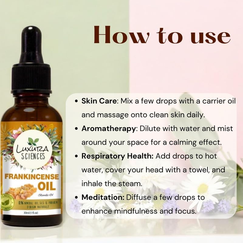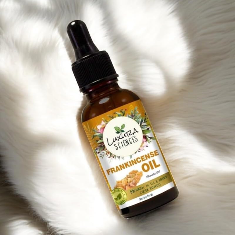 Luxura Sciences Organic Frankincense Essential Oil is derived from the Boswellia Serrata plant, carefully extracted to preserve its natural essence. This undiluted oil is free from additives, artificial fragrances, and alcohol, making it an excellent addition to your self-care and wellness routine. Known for its calming and grounding properties, frankincense has been cherished for centuries in aromatherapy, skincare, and relaxation practices. Its warm, resinous scent helps create a peaceful atmosphere, making it ideal for meditation, yoga, or simply unwinding after a long day. In aromatherapy, Frankincense Essential Oil promotes a sense of tranquility, helping to ease stress and enhance focus. Add a few drops to your diffuser to fill your space with its soothing aroma, or mix it with a carrier oil for a rejuvenating massage that melts away tension. Beyond its aromatic benefits, this oil is widely used in skincare routines to help refresh and revitalize the skin. When properly diluted, it supports a smooth, even-looking complexion by reducing the appearance of fine lines and blemishes. This versatile essential oil is a valuable addition to DIY skincare and wellness blends, whether incorporated into serums, lotions, or homemade bath soaks. Its naturally uplifting properties make it an excellent choice for those looking to create a holistic self-care ritual. Packaged in a high-quality glass bottle with a precision dropper, Luxura Sciences Organic Frankincense Essential Oil allows for controlled and effortless application. Whether you are looking to create a relaxing ambiance, enhance your skincare routine, or enjoy a moment of calm, this essential oil is your go-to for a naturally refreshing experience.