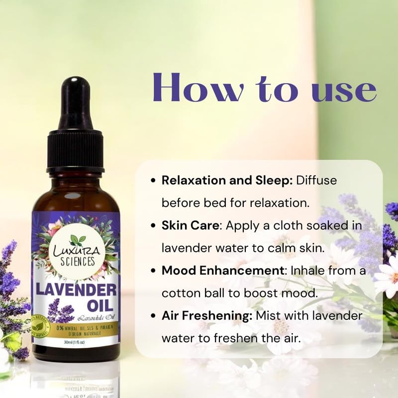 Unwind and embrace the soothing essence of lavender with Luxura Sciences Organic Lavender Essential Oil (30ML)—a premium, steam-distilled essential oil crafted for ultimate relaxation and well-being. Sourced from the finest artisanal farms in the South of France, this essential oil is carefully extracted to retain its natural potency and purity. Free from unnecessary additives, it’s a trusted companion for those looking to enhance their self-care rituals naturally. A few drops in a diffuser can instantly create a tranquil atmosphere, helping to ease daily stress and set the mood for relaxation or deep focus. Whether you need to unwind after a long day, enrich your meditation practice, or simply enjoy a calming ambiance, this oil brings an instant sense of serenity to your space. Beyond its aromatherapy benefits, Luxura Sciences Lavender Oil is a multitasking marvel for beauty and wellness. Blend it into DIY skincare, bath soaks, massage oils, or hair treatments to enjoy its naturally soothing and refreshing properties. Adding a few drops to your nighttime skincare routine can help your skin feel revitalized and refreshed, while massaging it into your scalp with a carrier oil can promote a relaxing head massage experience. For those who enjoy handmade personal care products, this versatile essential oil can be used in the creation of body scrubs, hair serums, perfumes, or even linen sprays for a delightful, long-lasting fragrance. The rich floral aroma brings a sense of calm and comfort, making it an excellent companion for moments of self-care and mindfulness. The convenient dropper bottle ensures precise and easy application, allowing you to use just the right amount—whether for diffusing, blending into carrier oils, or adding a touch of floral freshness to your daily routine. Elevate your senses and embrace the power of nature with Luxura Sciences Lavender Essential Oil—a fragrant, luxurious addition to your wellness journey.