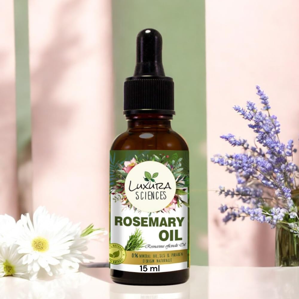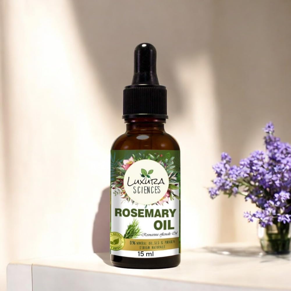 Luxura Sciences rosemary essential oil for hair growth skin care nail strengthening aromatherapy soothing scalp massage pure and natural therapeutic grade oil for relaxation wellness 15ml